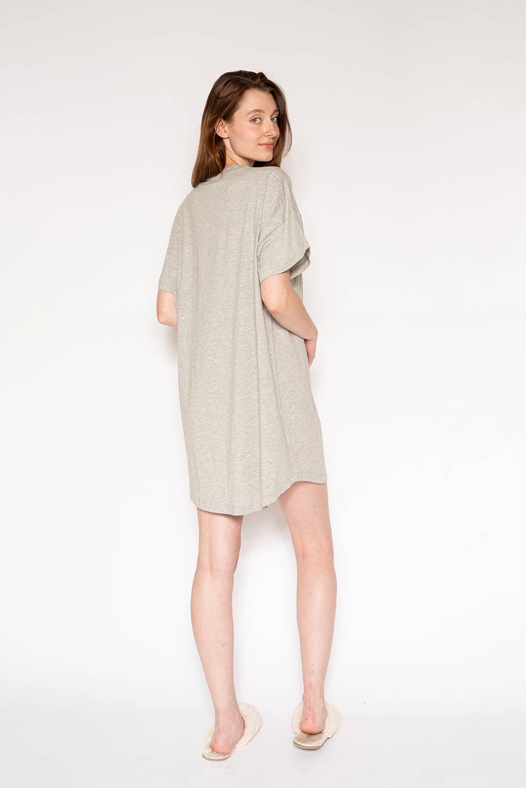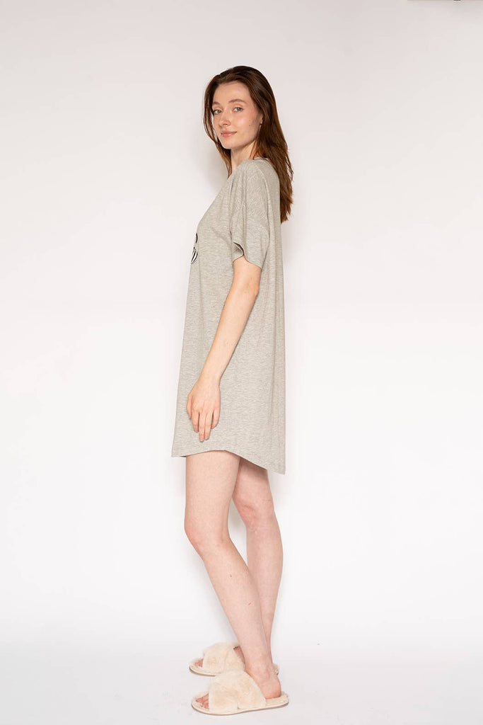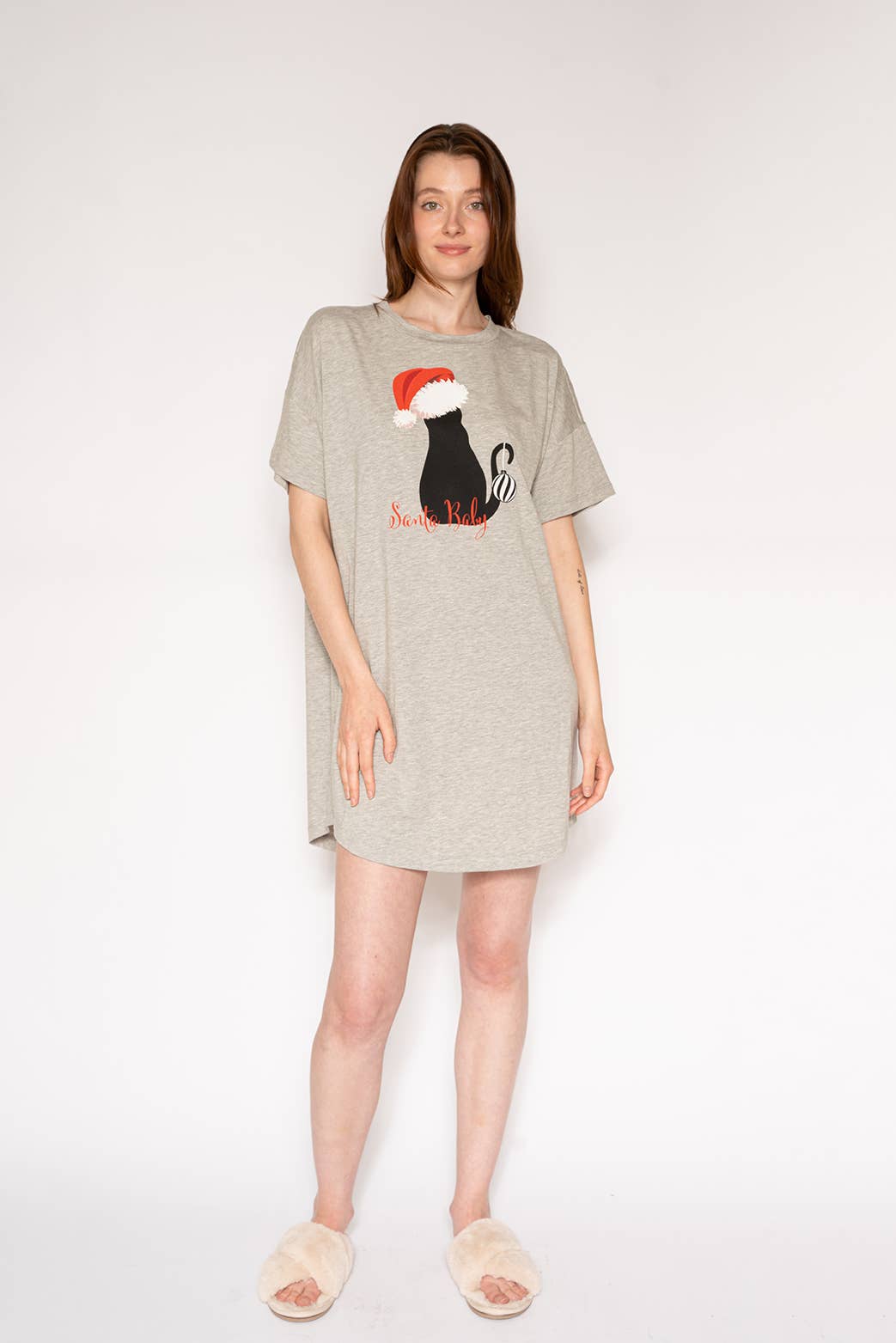Always be festive and fabulous in our relaxed fit "Santa Baby" graphic print sleep t-shirt dress. Made in a supremely soft knit cotton modal blend, you'll find yourself wearing this short-sleeve sleepshirt around the house all day long and maybe all night long. These also make a great gift.