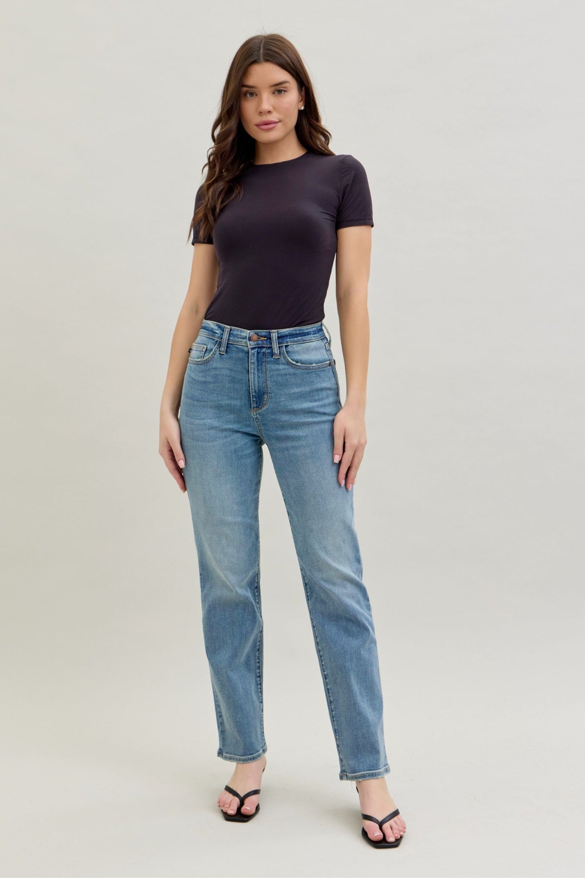 A classic shape that you can never go wrong with, the staright leg. Judy Blue denim hugs all the right places, provides incredible comfort and stretch. Featuring the perfect amount of stretch, high rise, straight leg and is done in a medium blue wash for everyday styling.