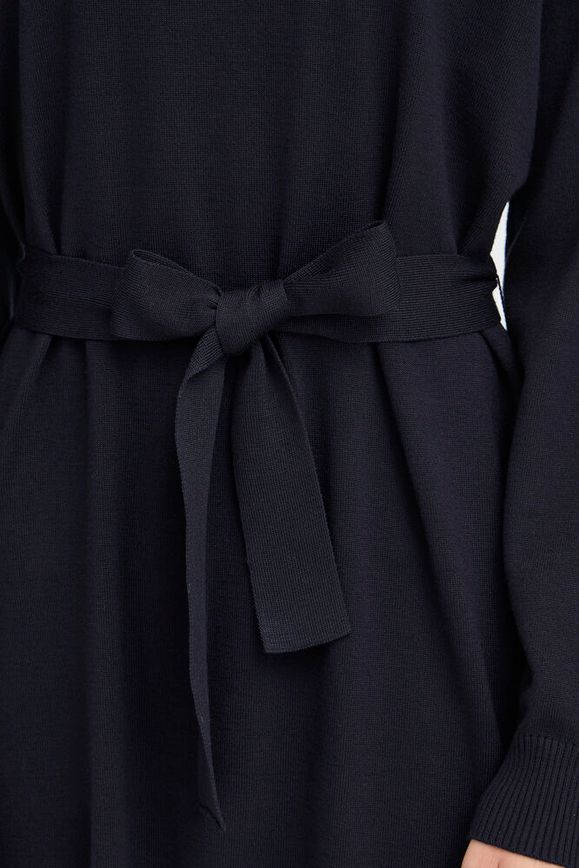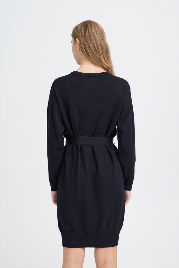 Our Luls Knit Dress from ICHI is a wardrobe essential that combines minimalistic design with versatile styling. Featuring a deep, rich Total Eclipse Navy color, flattering shape & fit, belted at the waist and is ideal for both professional and casual wear.