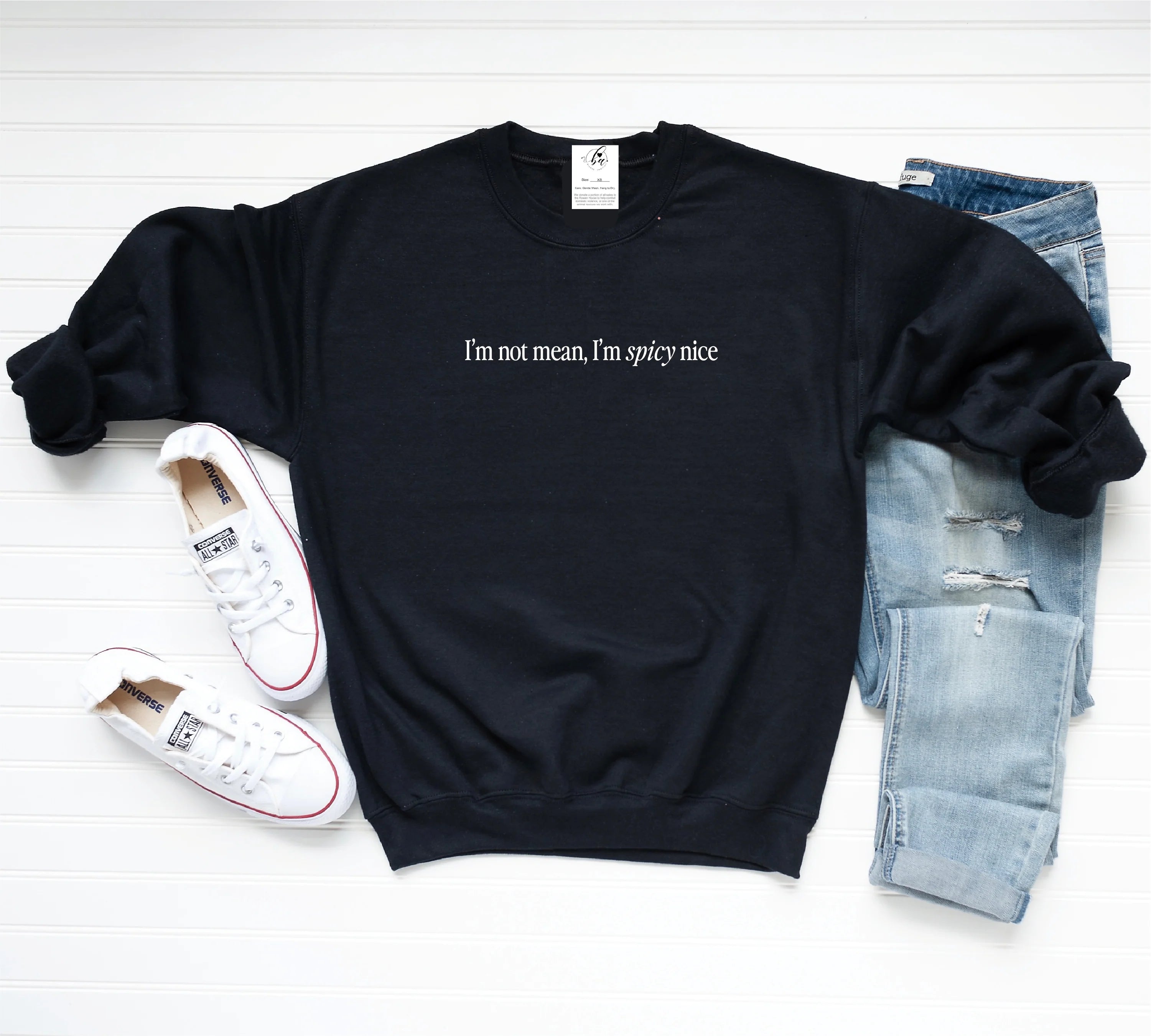 Let your style shine through with our I'm not Mean, I'm Spicy Nice Crew. Show your edge and let your personality speak louder than words. Featuring a black body with white lettering and a plush, cozy feel.