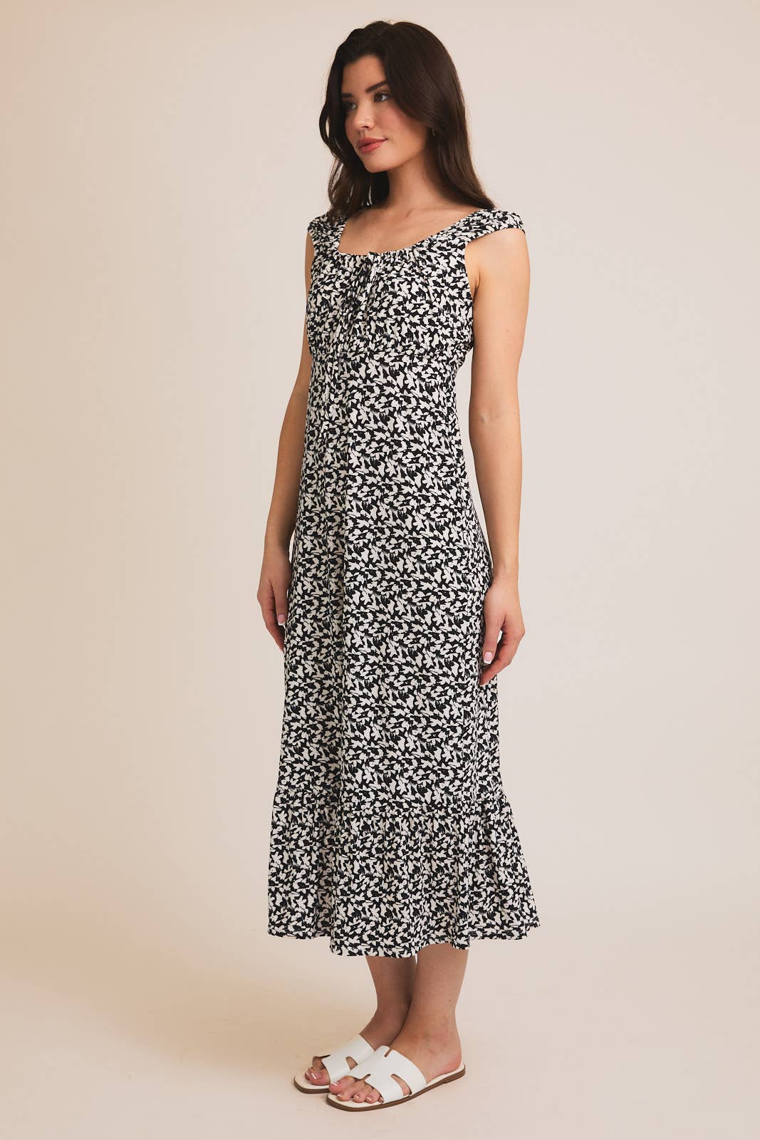 This great midi dress is going to be a go to style for seasons to come. Featuring a midi length with ruffle bottom, elasticized under the bust for a flattering shape, cap sleeves, scoop neckline with functional drawstrings and a fun black and white abstract pattern throughout.