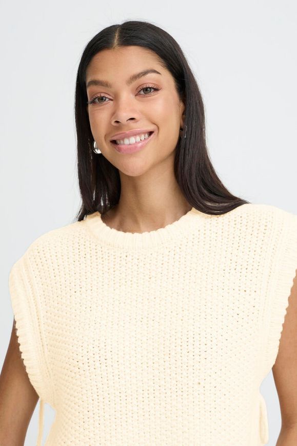 Look chic, put together and effortless in this Knit Slipover from B.Young. Featuring a boxy silhouette, extended shoulders and ribbed crew neckline and the side tie details add a subtle accent.