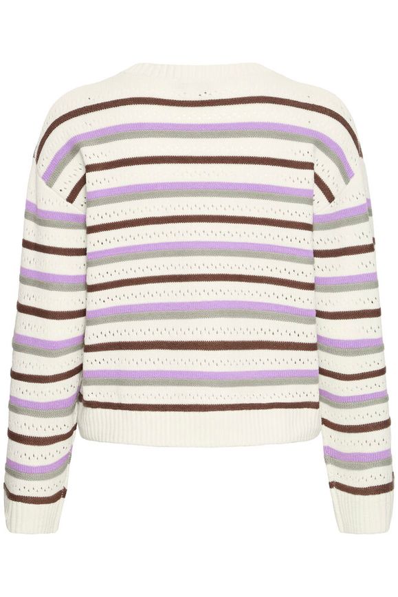 This knit sweater offers a relaxed fit and long sleeves for comfortable everyday wear. Featuring a classic crew neckline, ribbed edges provide a timeless, versatile design and a retro inspired lavender and brown stripe on a birch coloured base.
