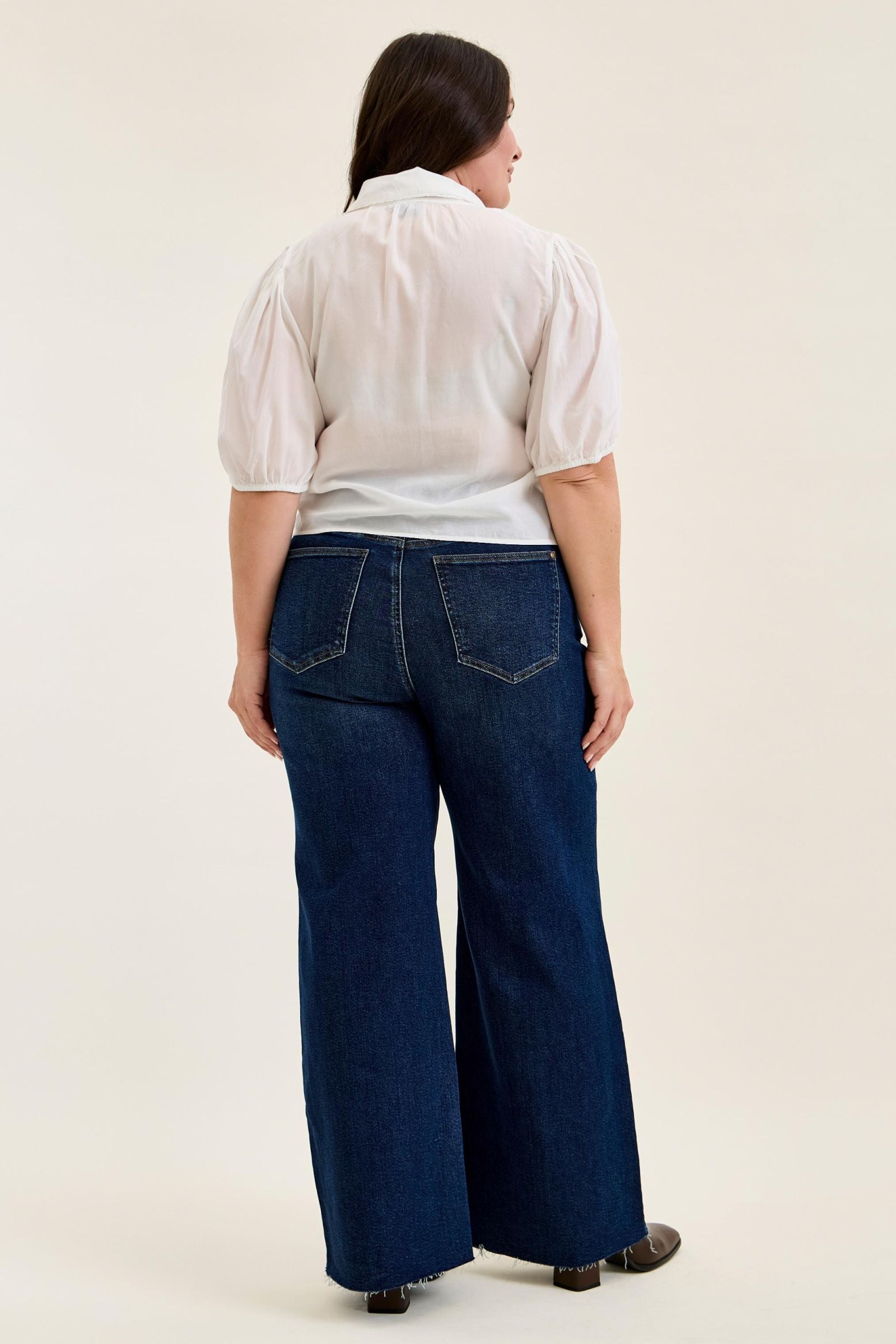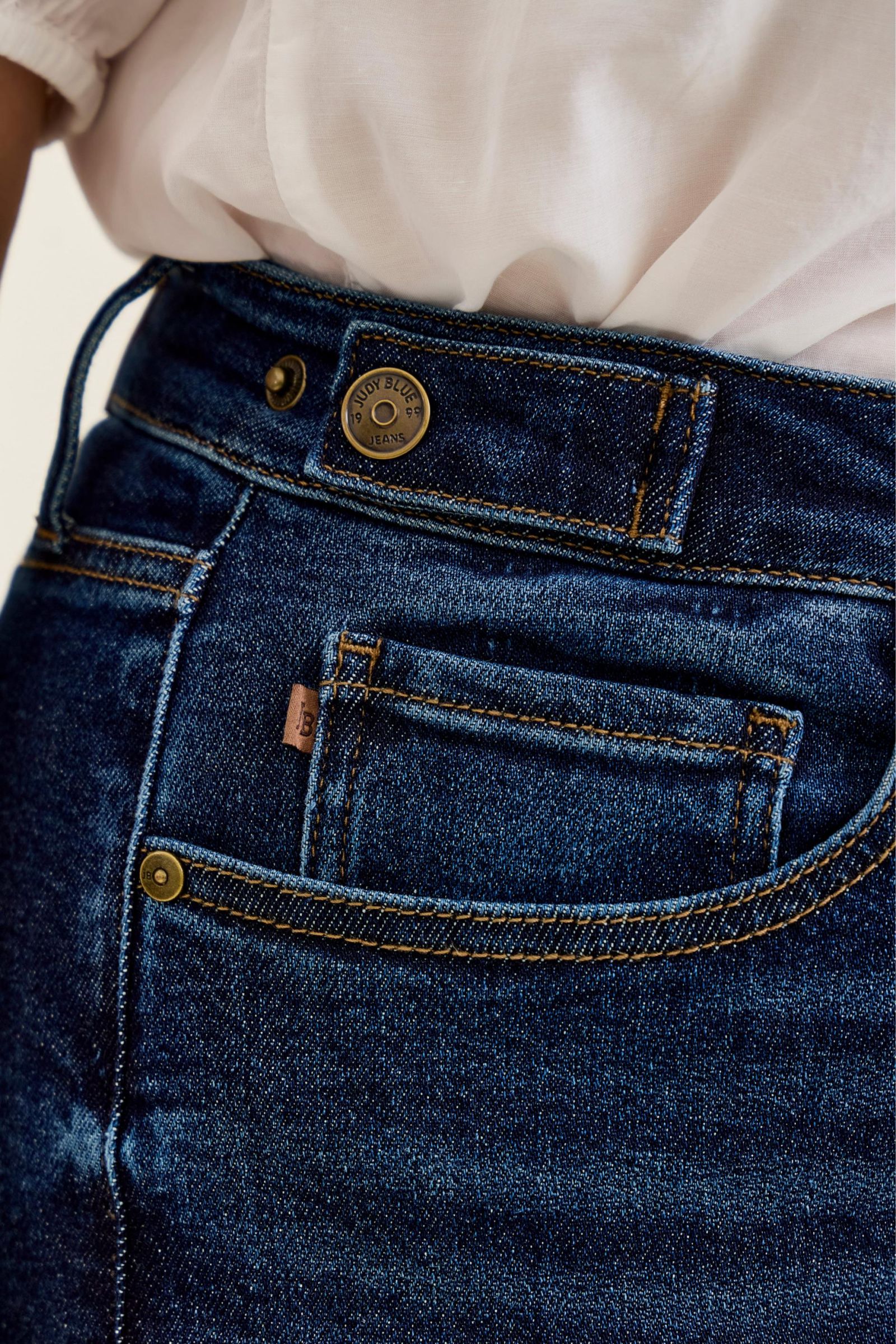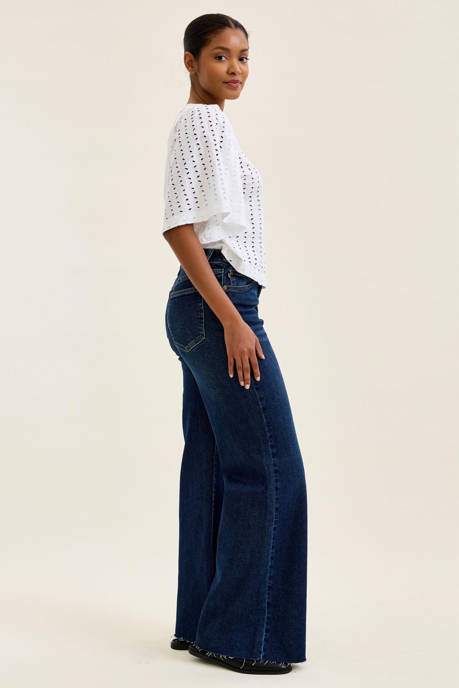 This wide leg denim by Judy Blue are a fantastic way to add a modern look to your wardrobe. Featuring a dark wash, retro shape, high rise, adjustable side tabs on the waist for a custom fit, raw hem bottom and comfort stretch that moves with you.