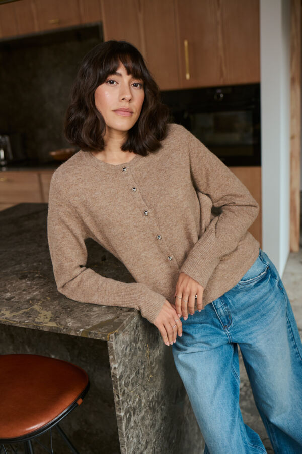 This Cardigan from Kaffe proivides timeless style and a warm comfort. Featuring a relaxed fit, round neckline, button front closure, warm toasted coconut colour, long sleeves and ribbed cuffs. Ideal for layering in both casual and work styling.