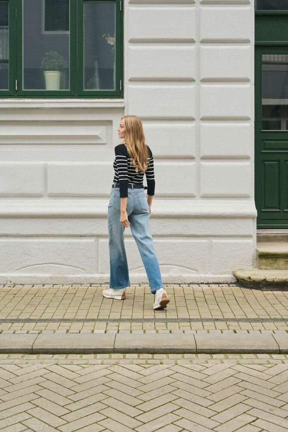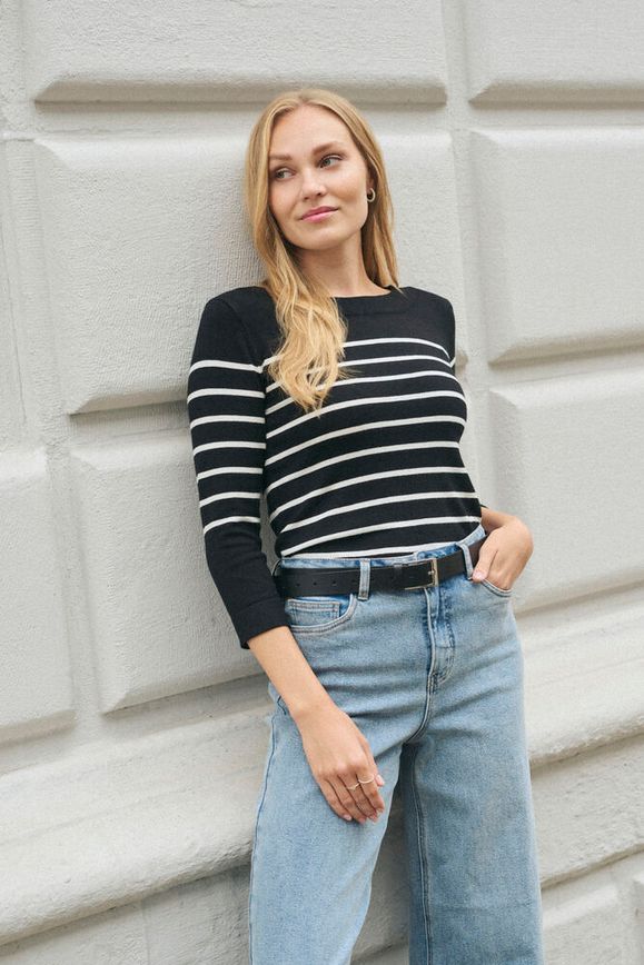 Our Lizza knit features long sleeves, chic boatneck, lightweight knit fabric, black and chalk striped body for a classic colour combo and a shaped body. The Lizza options by Kaffe are a customer favourite that can be styled with a great denim, trousers or a skirt.