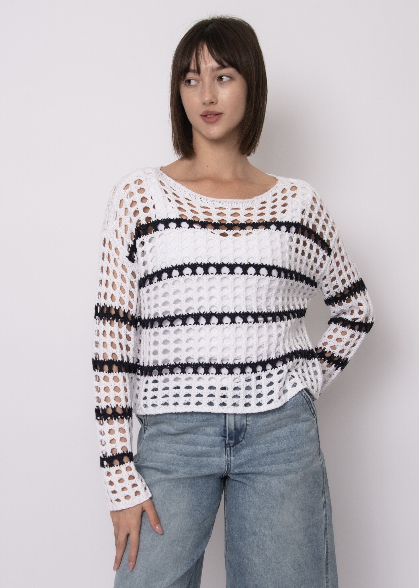 The Ensyn Pullover by RD Style will have you feeling cool summer evenings with its lightweight knit and white base with navy stripes across the body. Featuring a relaxed body, wide knit, soft fabric and pairs effortlessly with a cami for an airy summer top.