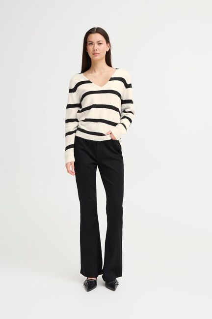 Making layering up easy with this mid-weight v-neck sweater from ICHI. This sweater features a traditional shape that is ideal to layer with a collared shirt for addional styling options, white base with black sttipes and a wide v-neck.