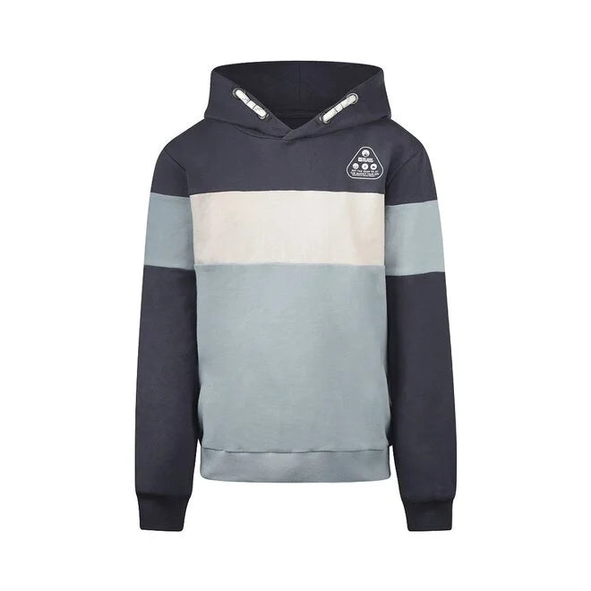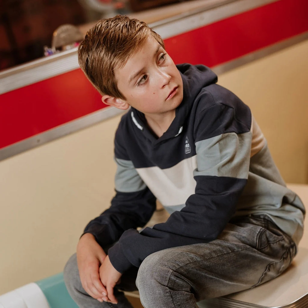 Get ready for chilly days with this eye-catching hoodie. This boys' hooded sweatshirt stands out with bold colour patches in anthracite, light blue and off white that create a playful and modern effect. The hoodie has a relaxed fit and is perfect to pair with your favourite joggers.